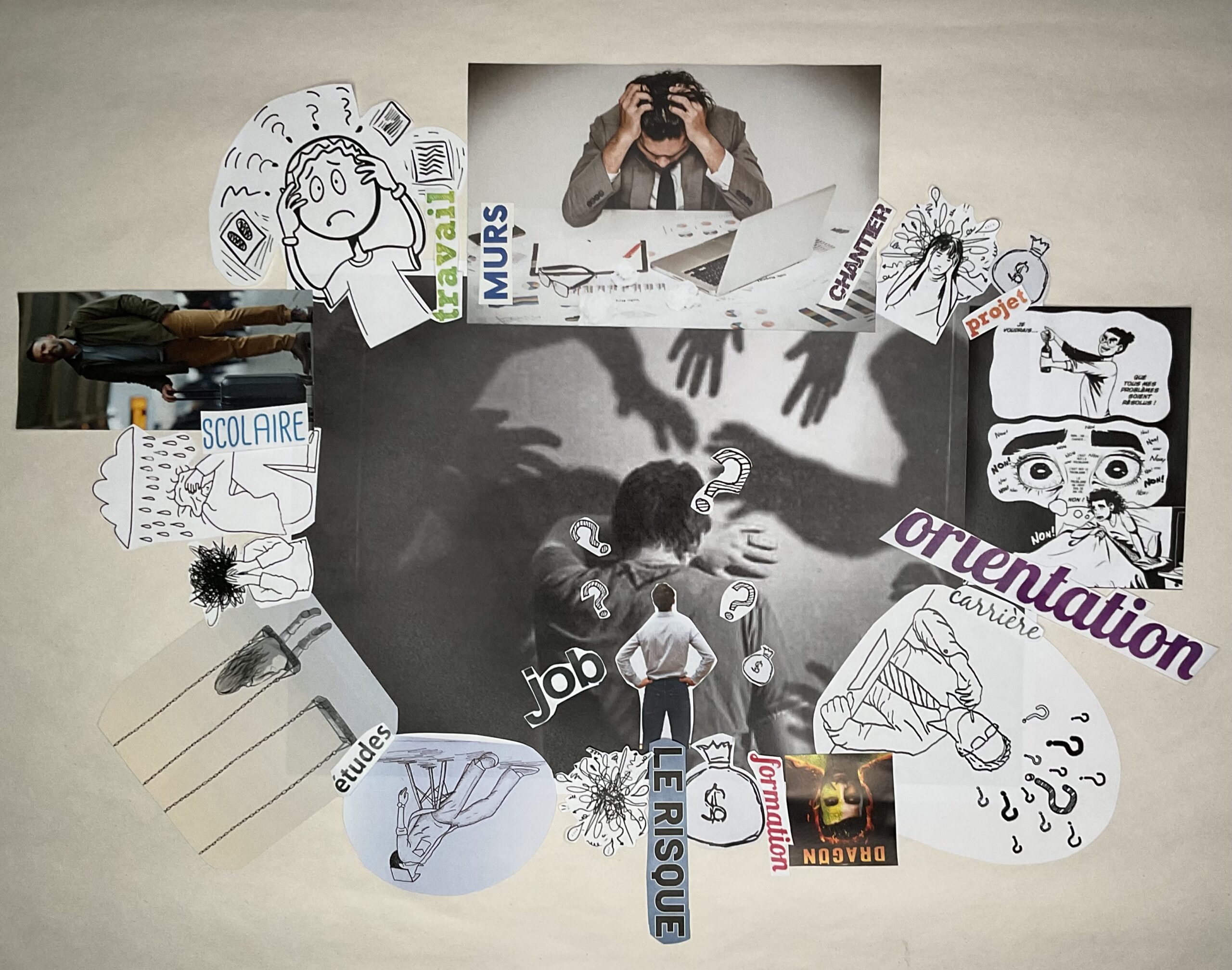 Le collage du fils, à l’inverse, s’inscrit dans une dynamique de projection positive : le désir de rester connecté à ce qui l’anime, la nécessité de préserver son identité et la confiance en lui comme leviers pour saisir de futures opportunités. Faire ce qu’il aime, continuer de s’amuser et trouver du plaisir dans son travail lui apparaît comme une évidence, d’autant plus lorsqu’il observe son père confronté à une situation de burn-out.