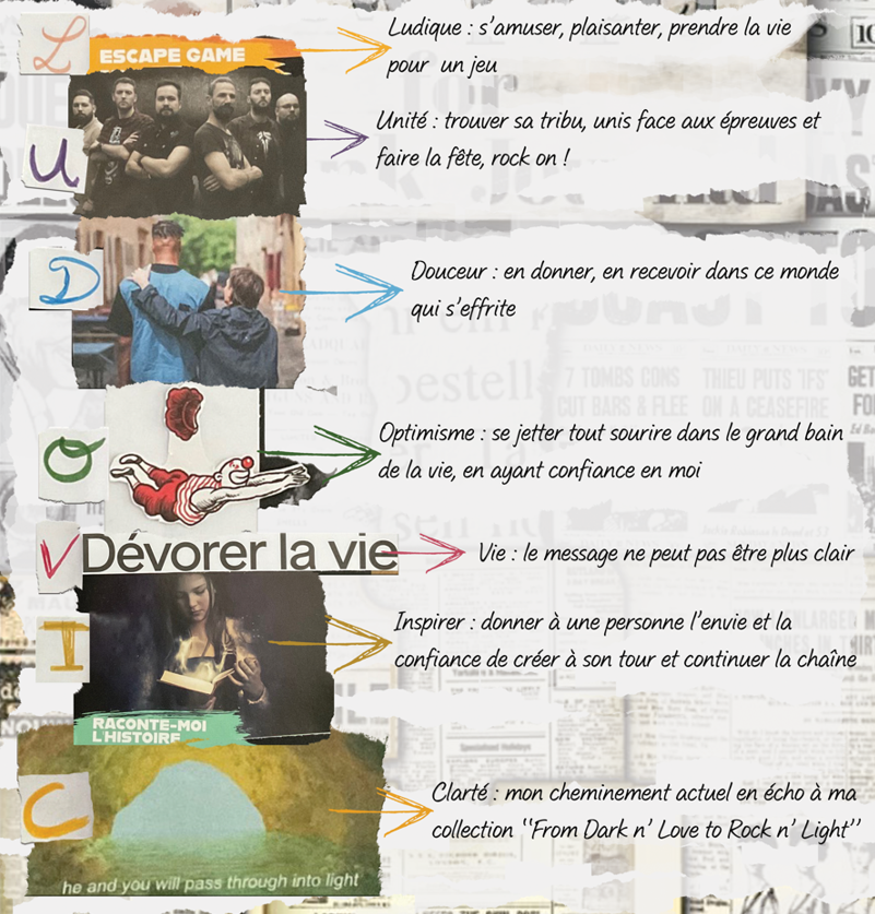 Dans mon exemple, mon prénom Ludovic : Ludique, Unité, Douceur, Optimisme, Vie, Inspiration, Clarté…
