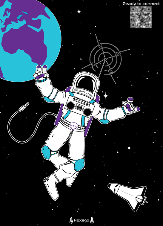 En hommage, j’ai dessiné un astronaute anticonformiste, un câble de guitare (prise jack), comme ligne de sécurité débranché de la navette.