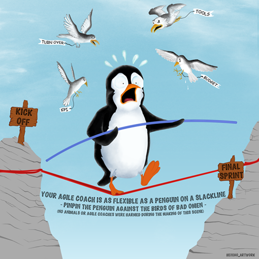 Rappelez-vous, votre coach Agile est parfois aussi flexible qu’un manchot sur une slackline, canalisant son funambule intérieur; soyez bienveillant envers lui.
