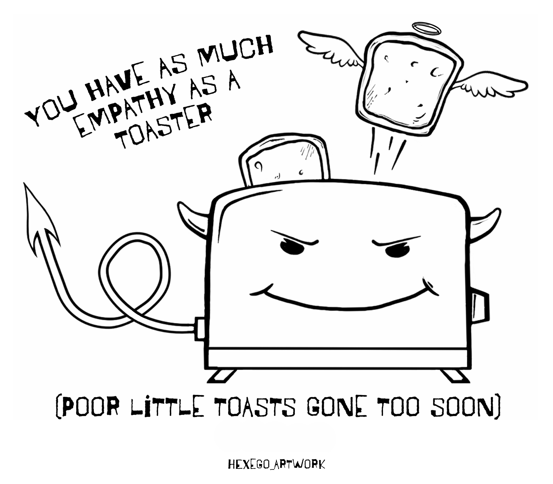 Lorsqu’une ancienne collègue me raconte que son chef est aussi empathique qu’un toaster de manière ironique… ça m’a donné l’idée d’en faire ce petit croquis, ces braves petits chefs qui crament les employés et les envoient au burn out
